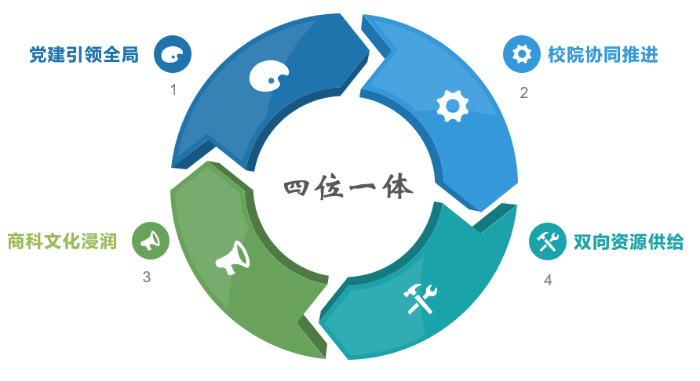 學校始終堅持構建“黨建引領全局、校院協同推進、商科文化浸潤、雙向資源供給”的“四位一體”的學生書香社區建設機製。