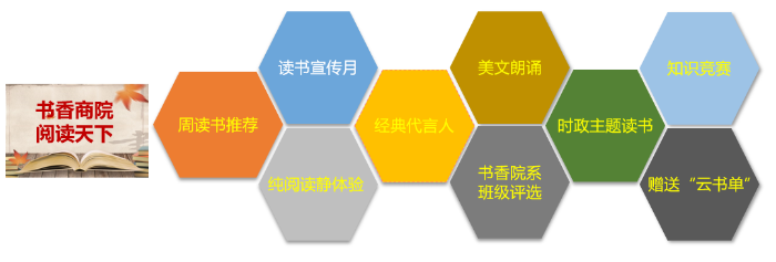 學校以培養“經道義、營民生、顧國謀利”的中華商人為本,將讀書活動作為抓手,積極打造學生閱讀的“軟環境”和“硬環境”,以文化活動提升讀書氛圍,以網絡互聯增進互動共享,以優雅環境實現“一站式”商科文化浸潤,營造濃鬱的“書香社區”文化氛圍。