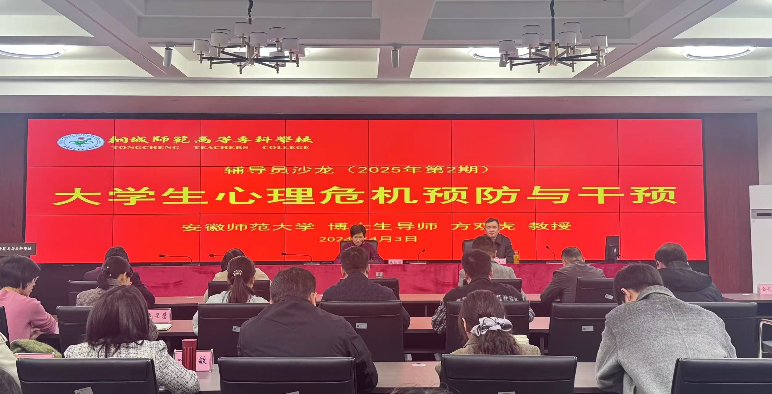 為進一步加強高校輔導員隊伍建設,提升輔導員專業素養與心理健康輔導實操能力,4月3日,我校特邀安徽師範大學心理谘詢研究所所長、心理學博士方雙虎教授來校開展“大學生心理危機預防與幹預”專題講座。學生處、各係分管學生工作副主任、各係學管幹事、全體專兼職輔導員、各班心理委員參會,講座由校黨委副書記張敏麗主持。
