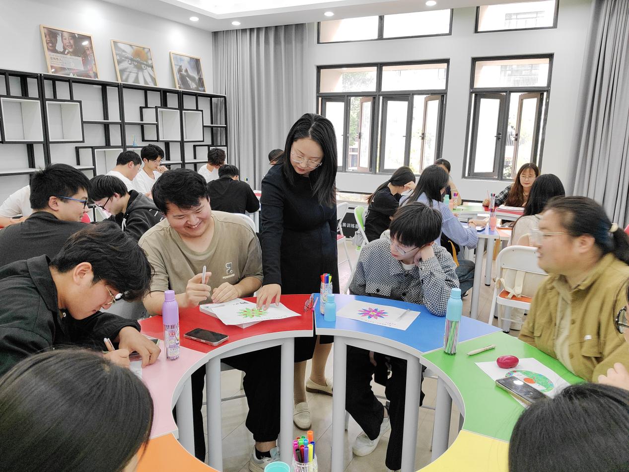在經過一段音樂放鬆訓練後,學生們開始進行彩繪曼陀羅。他們根據內心最直接的想法選擇顏色,在曼陀羅畫紙上塗色。或鮮豔明亮,或柔美細膩,或剛勁有力,一樣的圖案在不同人的筆下呈現出不一樣的意境,每一筆、每一劃,都在講述自己的情感、意象和故事的嚐試,每個人都在這個過程中深入探索自己的內心世界。