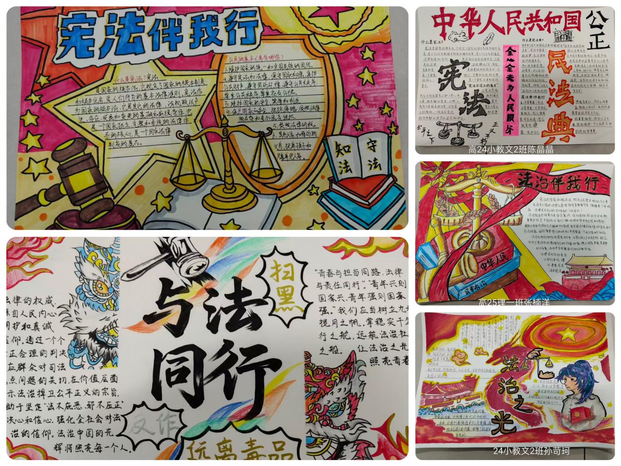 小學教育係、藝術與設計係舉辦“法治之光照亮青春賽道”手抄報比賽,鼓勵學生以筆為媒詮釋法治內涵。同學們圍繞《憲法》《民法典》核心條款,將法律條文轉化為紙上創意作品,既融入“憲法護航成長”等青春視角,又兼具法律專業性與藝術感染力,形成“以畫傳法、以藝普法”的傳播矩陣,讓學生在創作中深化對法律知識的理解與記憶。同時,學前教育係、旅遊與公共管理係、商貿與電子信息係相繼開展線上法治學習與知識競賽,將法治學習轉化為知識競賽,引導學生自覺成為憲法的忠實崇尚者、自覺遵守者、堅定捍衛者。