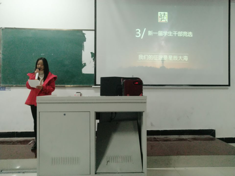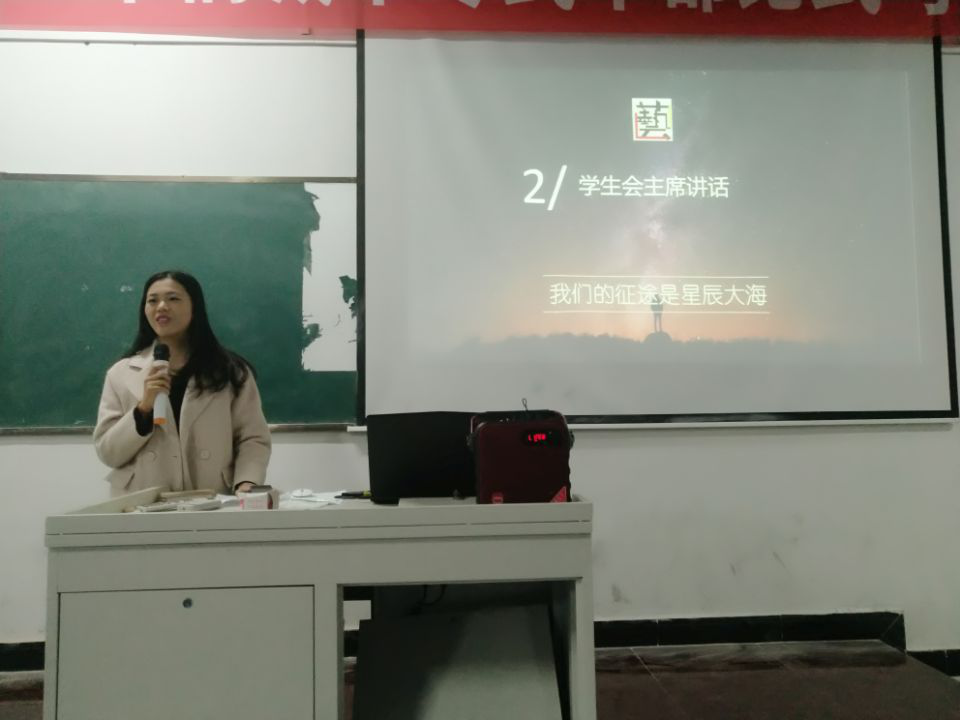 接著學生會主席王婷婷同學和大家分享了她在學生會工作的心路曆程,感謝了老師的幫助和同學的支持,希望新的主席團成員能夠“在其位,謀其政,擔其責”,通過攜手合作,把學生會的工作做得越來越好。