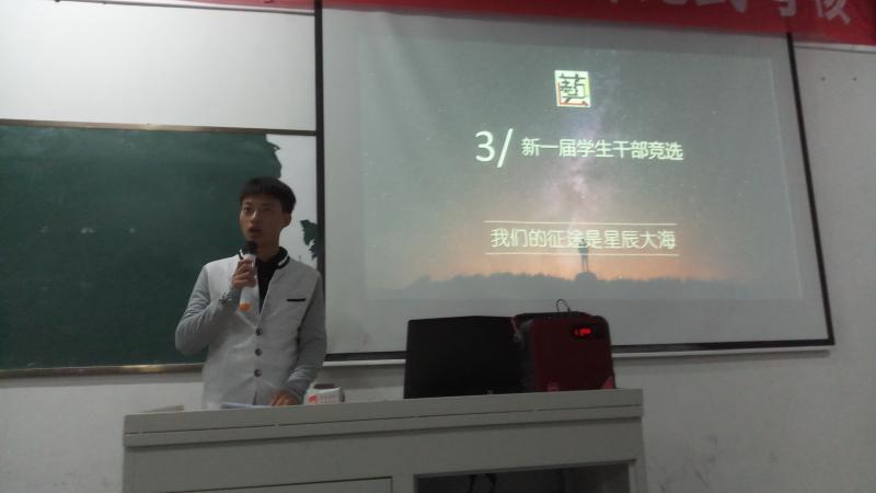會議第三項是新一屆學生幹部競選,我係2017-2018級學生會成員積極參加競選,參與競選的17位學生會成員紛紛上台展示自己,他們從部門任職、對自身缺點的改進,結合各自在學生會工作的點滴和未來展望等方麵來發表自己的競選演講。競選演講結束後,全體成員進行投票,產生新一屆學生會主席團成員及各部門部長。