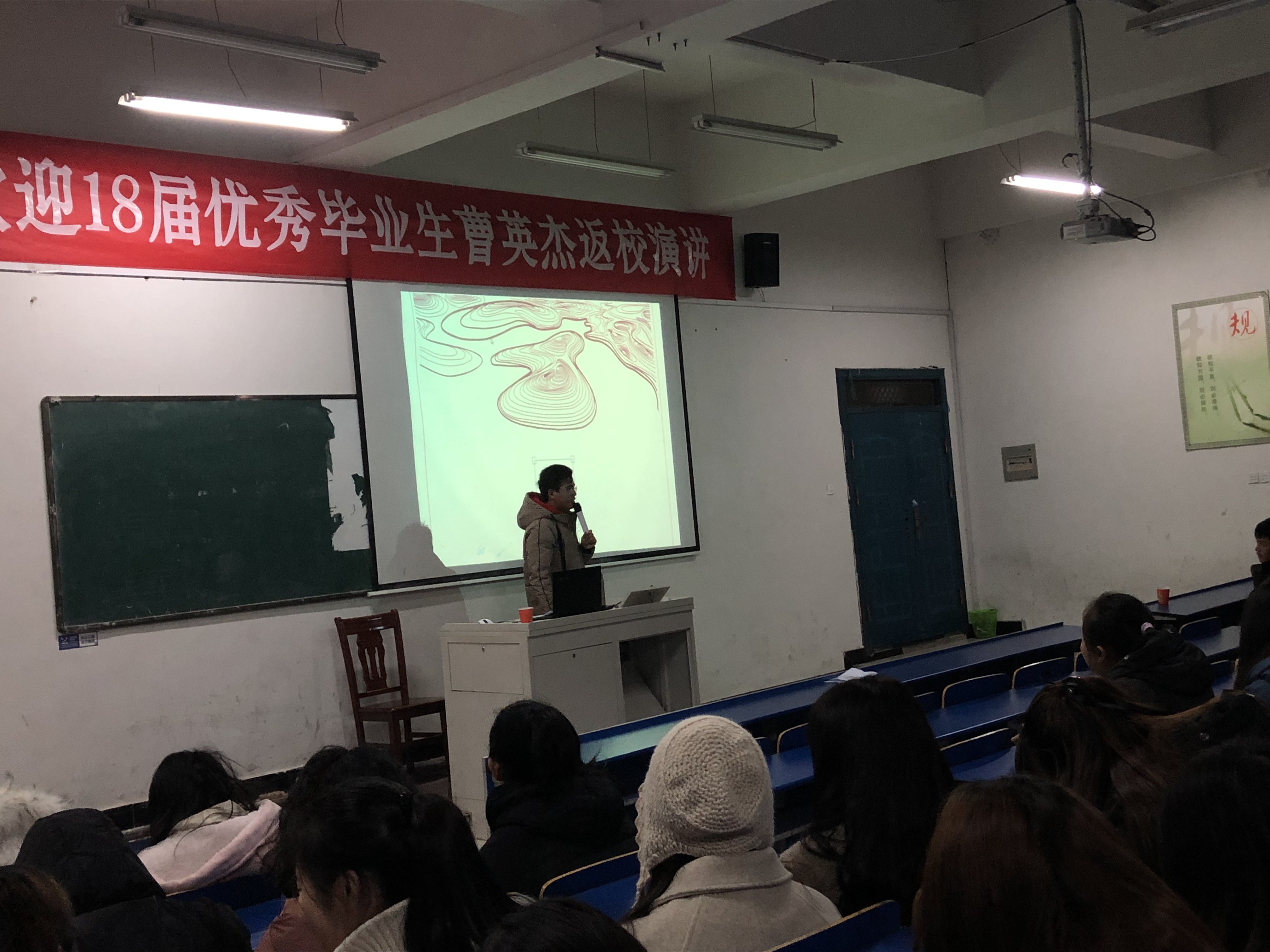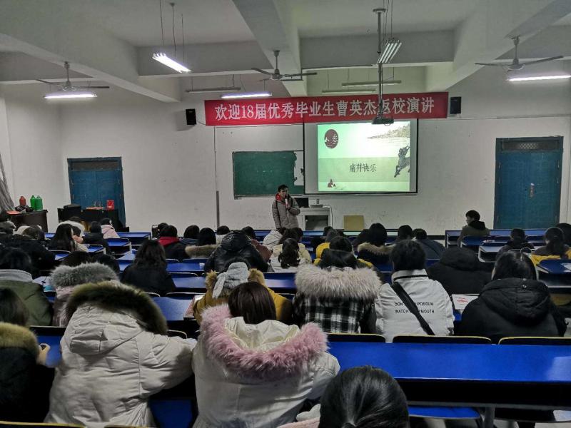 為鼓勵同學們發揚積極進取、勤思苦學的鑽研精神,2018年12月28日晚上7點,藝術與設計係在鯤池樓多媒體一舉辦了“優秀畢業生勵誌講壇”活動。本次活動邀請的是我係2018屆優秀畢業生的曹英傑同學,他通過演講的方式和學弟學妹們一起分享了他的學習和創業經驗。
