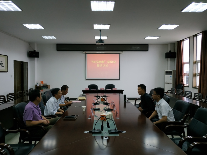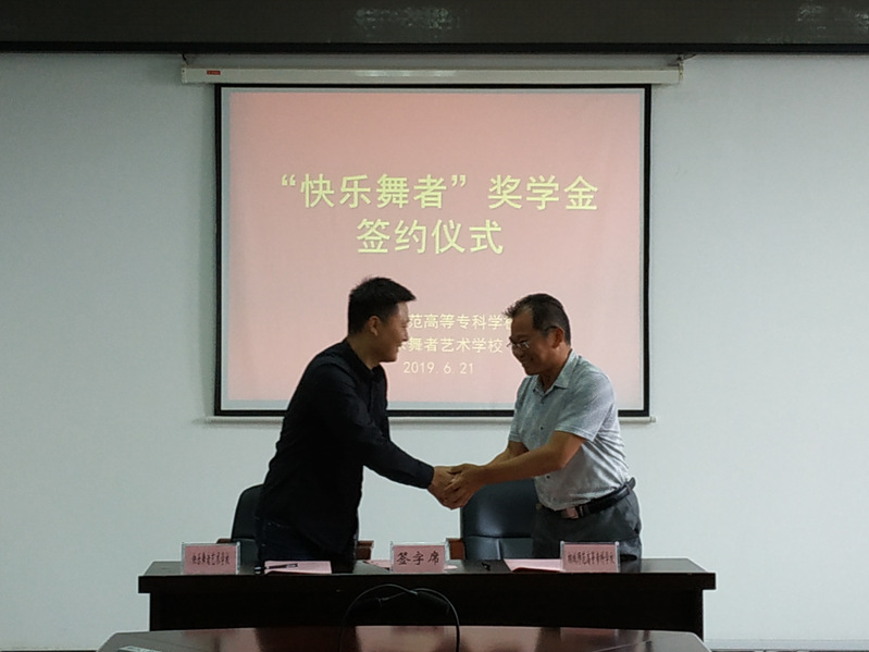 6月21日上午,“快樂舞者”獎學金簽約儀式在圖書館五樓會議室舉行。快樂舞者藝術學校校長夏華鬆、學校教務處處長黃洪沫、藝術與設計係書記高先軍和學生處副處長周琳參加了簽約儀式。