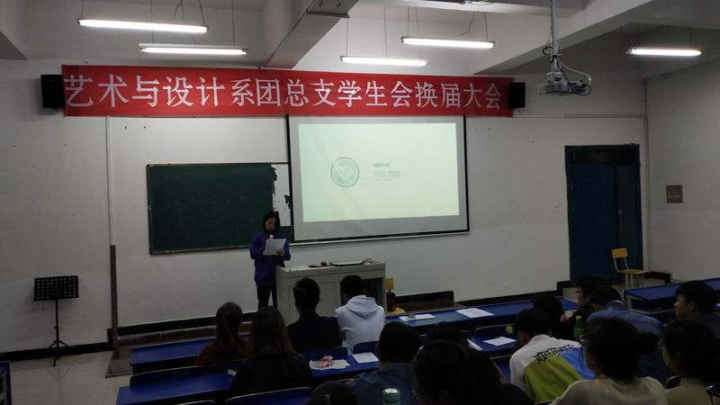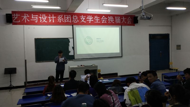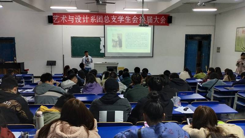 2019年11月17日19:00,藝術與設計係2019-2020學年團總支、學生會換屆大會在鯤池樓多媒體一教室舉行,會議由係學生會副主席薑晨晨主持。藝術與設計係副主任倪甜甜老師、團總支書記程周鵬老師,係團總支、學生會全體成員參加了會議。
