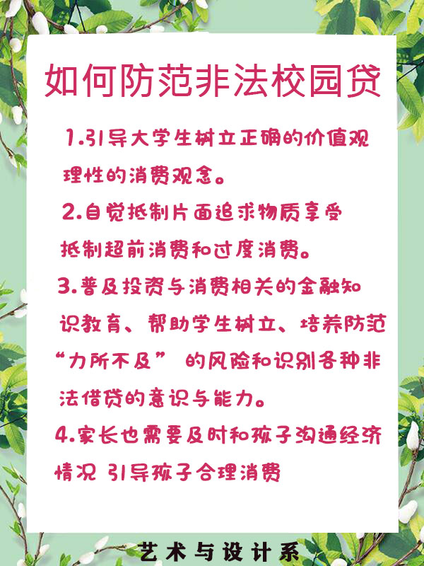 為切實保護在校大學生的生命財產安全,增強風險防範意識,提升自我防護能力,維護校園穩定,積極引導廣大在校師生對傳銷和“套路貸”、“校園貸”等違法犯罪活動不參與、能識別、敢揭發,有效遏製傳銷和“套路貸”、“校園貸”等違法犯罪活動向校園滲透, 201910-11月,藝術與設計係開展了“防止傳銷、拒絕校園貸”主題思政教育活動。