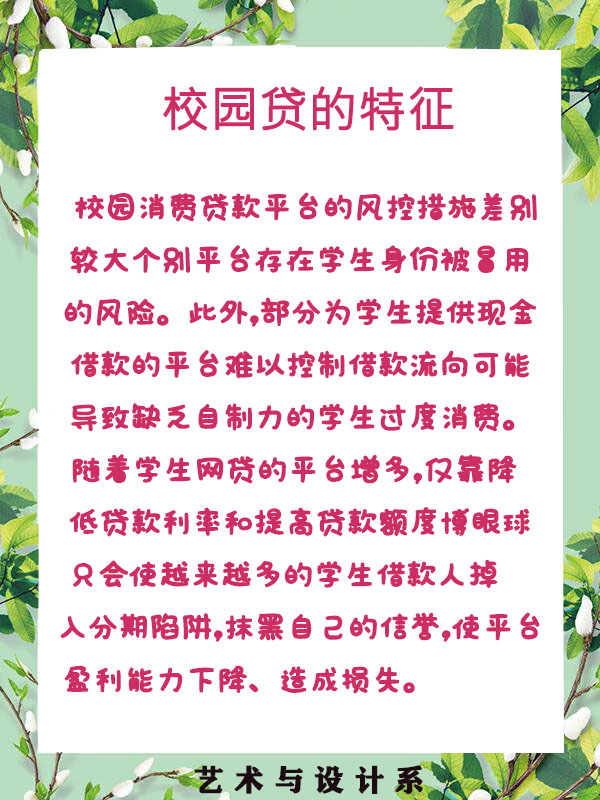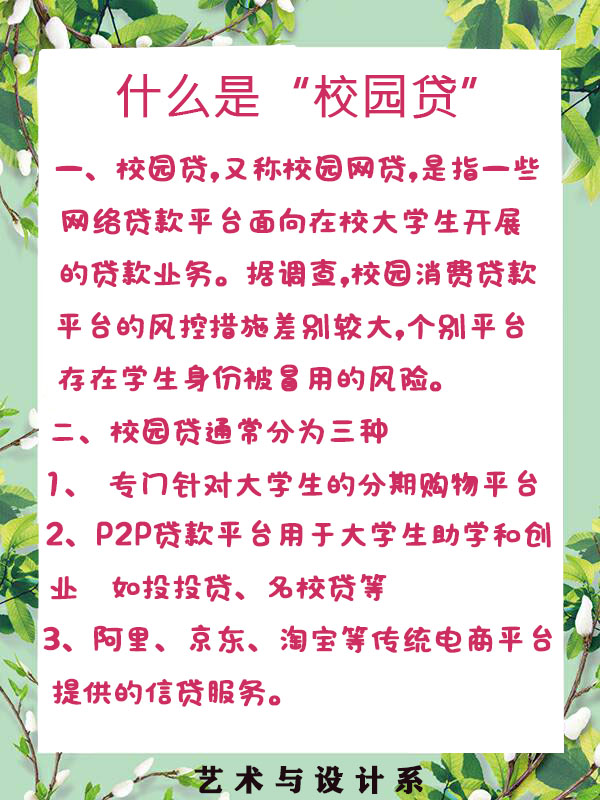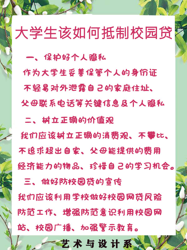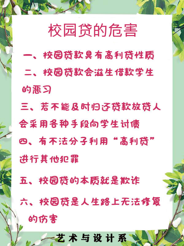 201911月,我係舉辦了以“拒絕校園貸”為主題的圖片展,地點在鯤池樓一樓大廳。通過圖文並茂的圖片向廣大師生介紹了什麽是校園貸、校園貸的特征、校園貸的危害、如何防範非法校園貸、大學生應該如何抵製校園貸等知識。圖片一經展出,受到了同學們的熱烈響應,同學們紛紛表示,對於校園貸,他們已經有了一定的了解,今後要加強對金融知識的學習,並要把校園貸的危害告訴身邊的親人和同學,提高大家的防範能力。