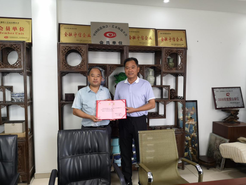 作為一家設計和加工仿古文化藝術品的公司,桐城徽煌工藝品有限公司近年來發展勢頭良好,目前擁有110多名員工。該公司在繼承傳統的“掐絲琺琅”工藝基礎上,不斷與時俱進、創新設計,作品曾在省市級展覽中多次獲獎2013年,青銅器《文樽》獲國家外觀設計專利;同年,獲中國藝術鑄造年會“創意金獎”。2015年,8件羊係列作品入選安徽博物院主辦的“羊年新春特展”。《文樽》榮獲桐城市人民政府首屆文學藝術二等獎。2016年,《李誠雕像》在安徽省工藝美術精品展“最高學術獎”評比中榮獲“創新獎”。2017年《李誠銅像》在桐城市人民政府第二屆文學藝術獎中獲二等獎,銅雕《三羊開泰》獲安慶第二屆民間藝術精品展金獎。2019年,掐絲琺琅(景泰藍)《蓮台六合瑞獸爐》在全國非遺傳承人作品聯展中獲金獎。