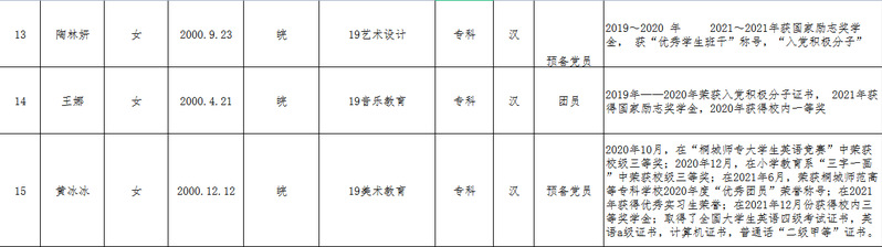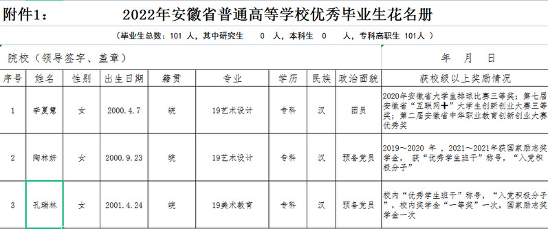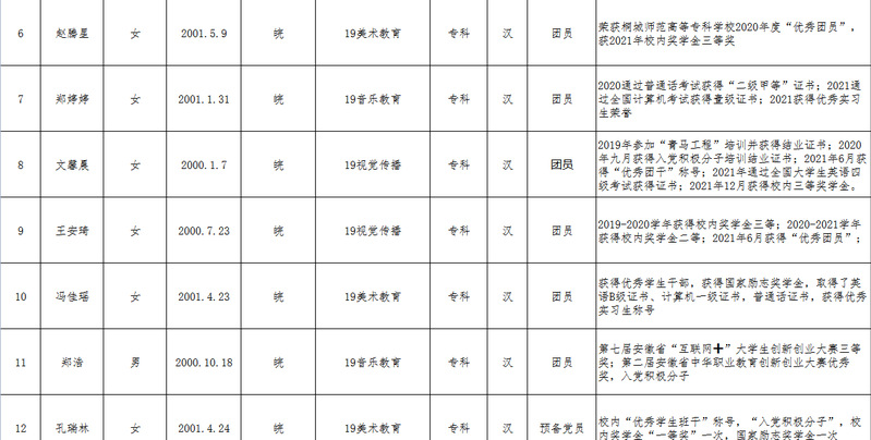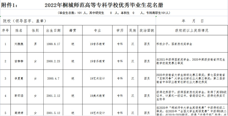 根據《皖教秘學〔2022〕4號 關於開展2022年安徽省高等學校優秀畢業生評選認定工作的通知》的文件精神,結合我係實際,本著公平、公正、公開、擇優的原則,經過個人自願申請、輔導員審查、班級評議、係部評議,擬推薦以下3名同學申報2022年安徽省高等學校優秀畢業生及15名同學申報2022年桐城師範高等專科學校優秀畢業生,現將結果予以公示三天。