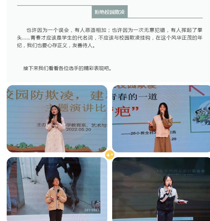 有14位同學報名參加本次大賽,每位參賽同學都精心準備好演講詞,與大家共同分享,共同了解校園欺淩對同學們身心健康的傷害,對和諧校園建設發展的不利影響。
