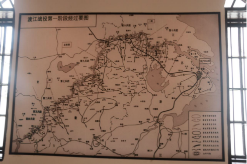 1949414日,在渡江戰役即將爆發的關鍵時刻,劉伯承、鄧小平來到這裏,召開師、地方地委級以上幹部會議。鄧小平在這次會議上傳達了黨的中共七屆二中全會精神,他深刻闡述了如何在全國範圍內取得勝利,如何鞏固發展勝利成果。劉伯承號召部隊用最大力量進行渡江作戰的準備。他明確指出:不管是和是戰,都要打過長江去,解放全中國。從這張地圖可以看到渡江戰役規模宏大,史無前例。正是人民解放軍大無畏的革命精神取得了渡江戰役的勝利。