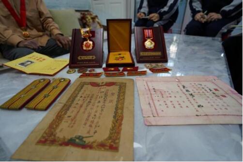 到達吳老家,映入眼簾的就是桌上的獎章和勳章。實踐小組仔細觀摩這些勳章,心靈都受到了非常大的震撼,對吳爺爺滿是敬佩和崇拜。
