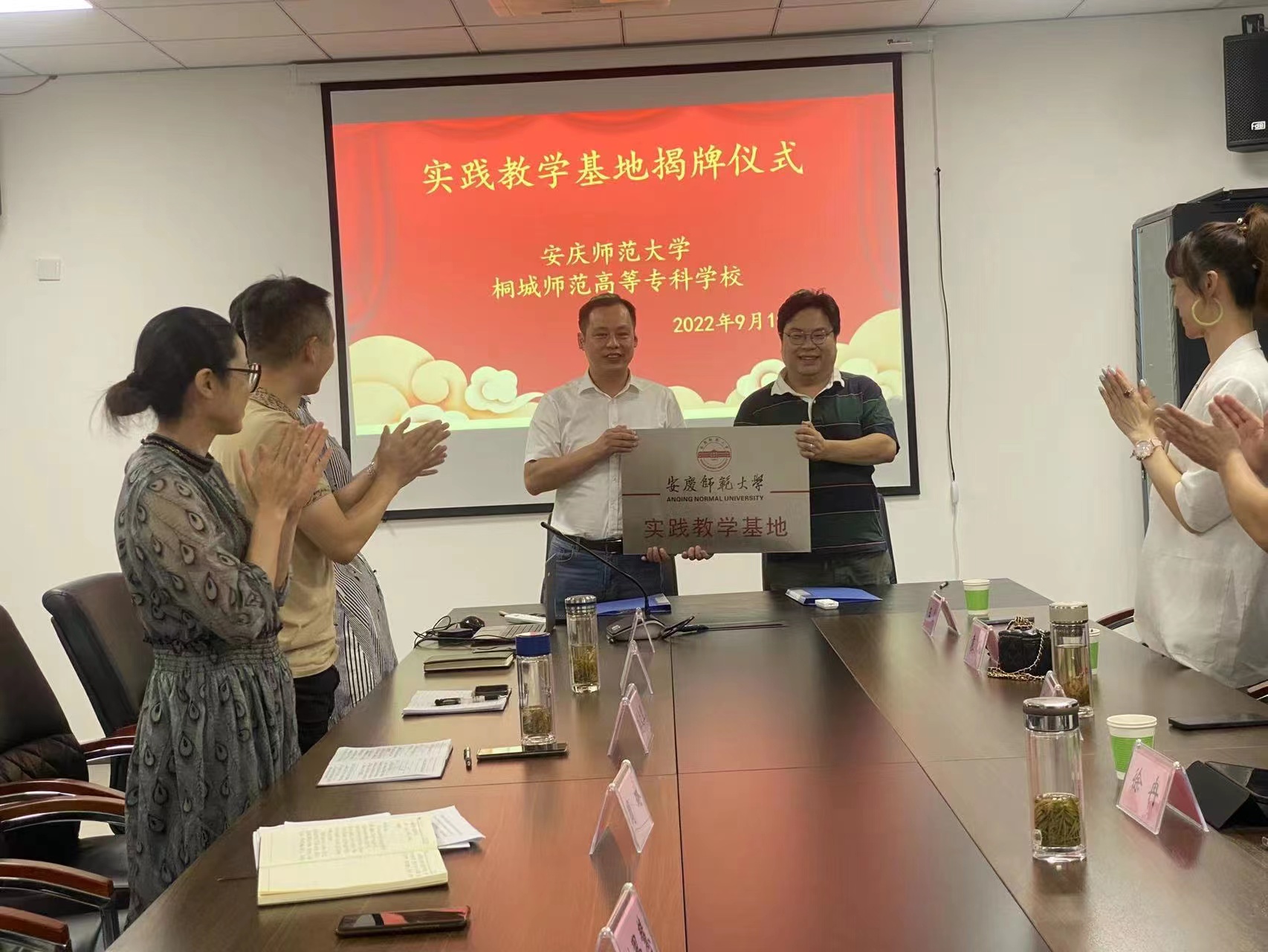 9月19日,安慶師範大學音樂學院教學實踐基地揭牌儀式在我校舉行。安慶師範大學音樂學院副院長徐冉、彭傳山,我校教務處處長程愛蘭、副處長張波、藝術與設計係黨支部書記周琳、副主任張倩等參加了簽約揭牌儀式。儀式由程愛蘭主持。