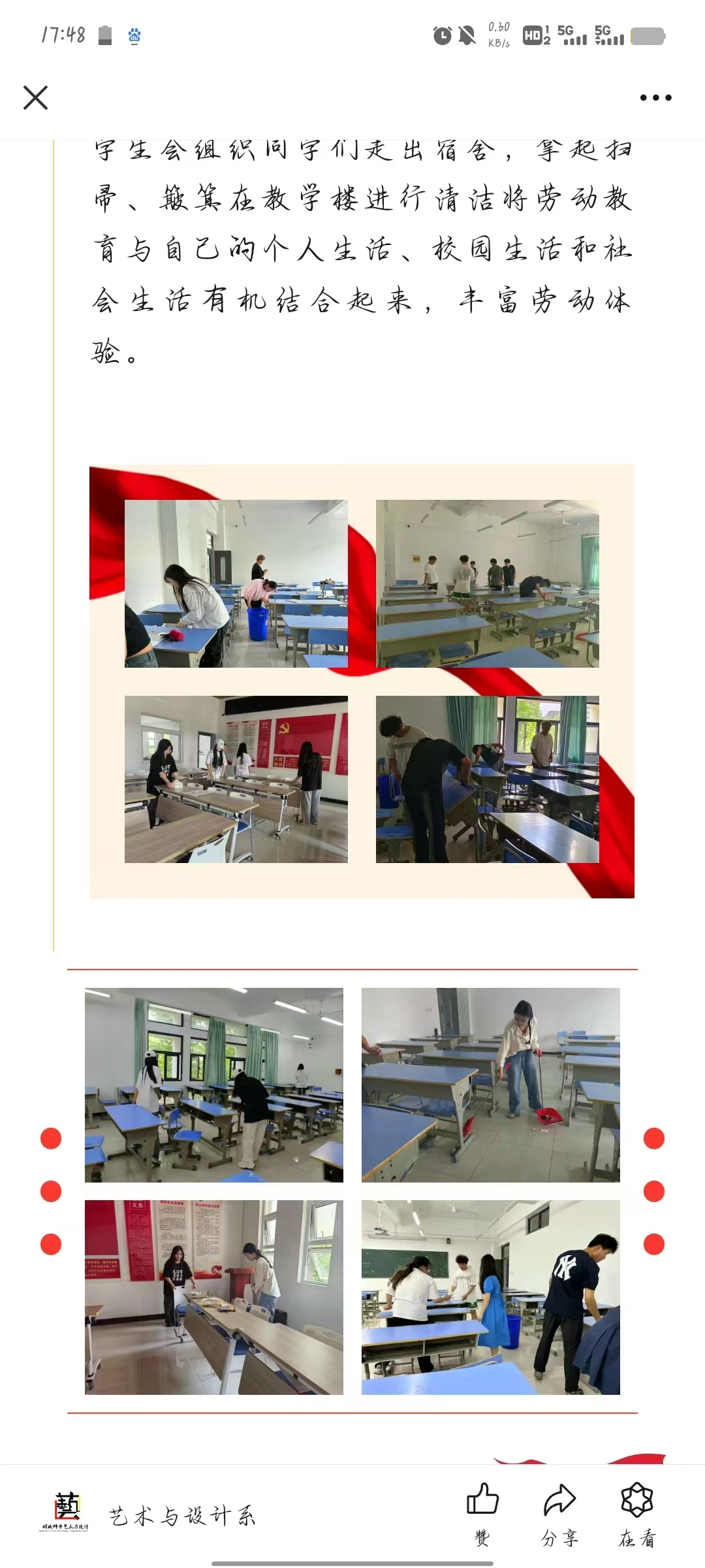 勞動創造幸福生活。為深入學習貫徹黨的二十大精神和習近平總書記關於勞動教育的重要論述,堅決落實好相關文件精神,聚焦立德樹人根本任務,構建以勞樹德、以勞增智、以勞強體、以勞育美的綜合育人價值體係,進一步鞏固學校勞動教育成果。藝術與設計係於5月組織開展了一係列勞動主題教育實踐活動。