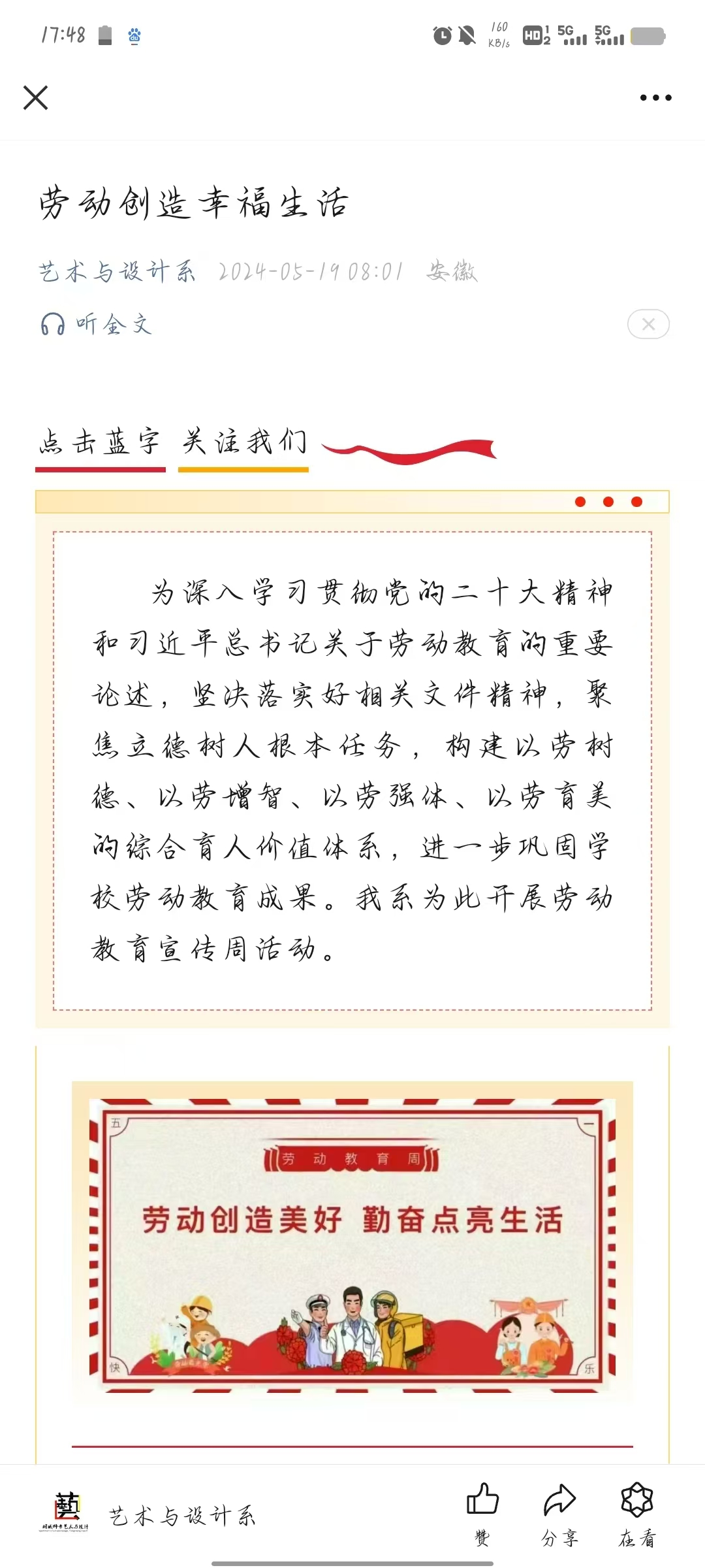 為更好的宣傳勞動精神,在係部營造勞動氛圍,係部在微信公眾號上發了一篇主題為“勞動創造幸福生活”的推送。