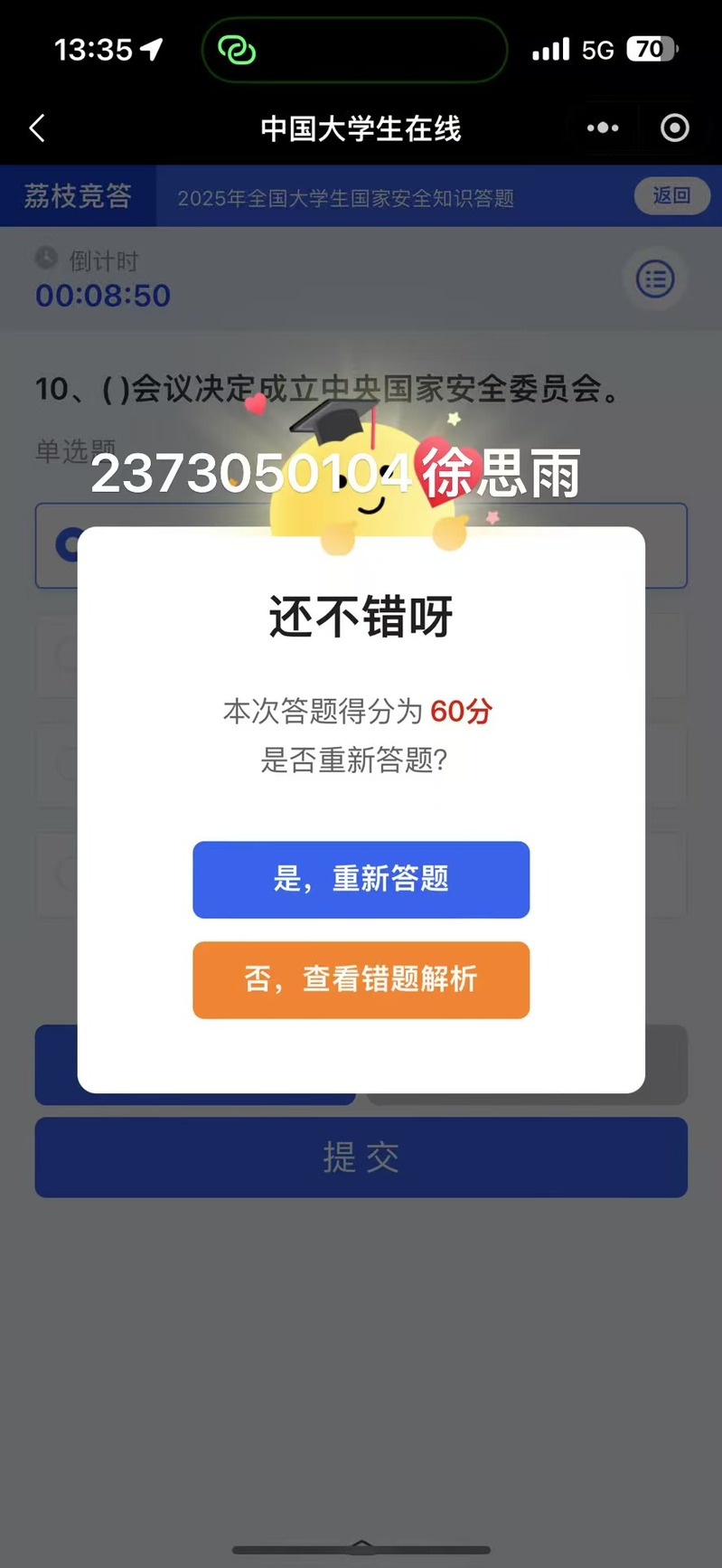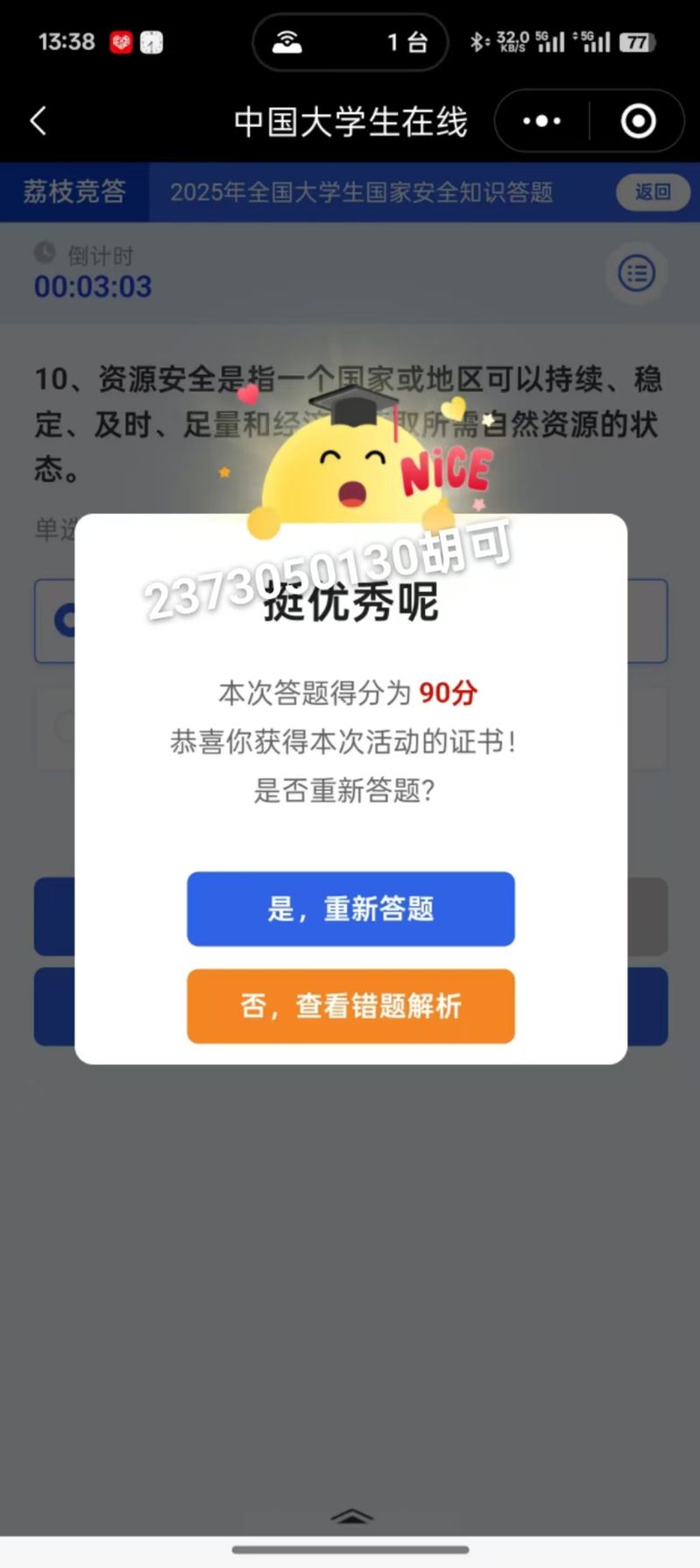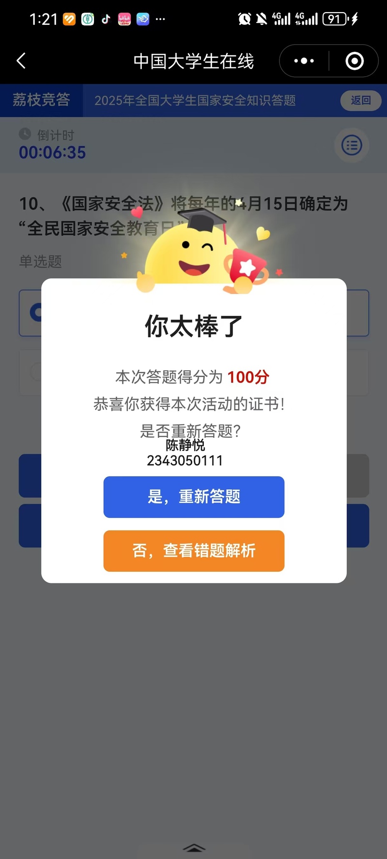 4月中旬,組織學生通過中國大學生在線網站或微信公眾號參與線上“全國大學生國家安全知識答題活動,通過答題活動引導同學們堅定維護國家政權安全、製度安全、意識形態安全,營造國家安全人人參與、人人有責的濃厚氛圍。