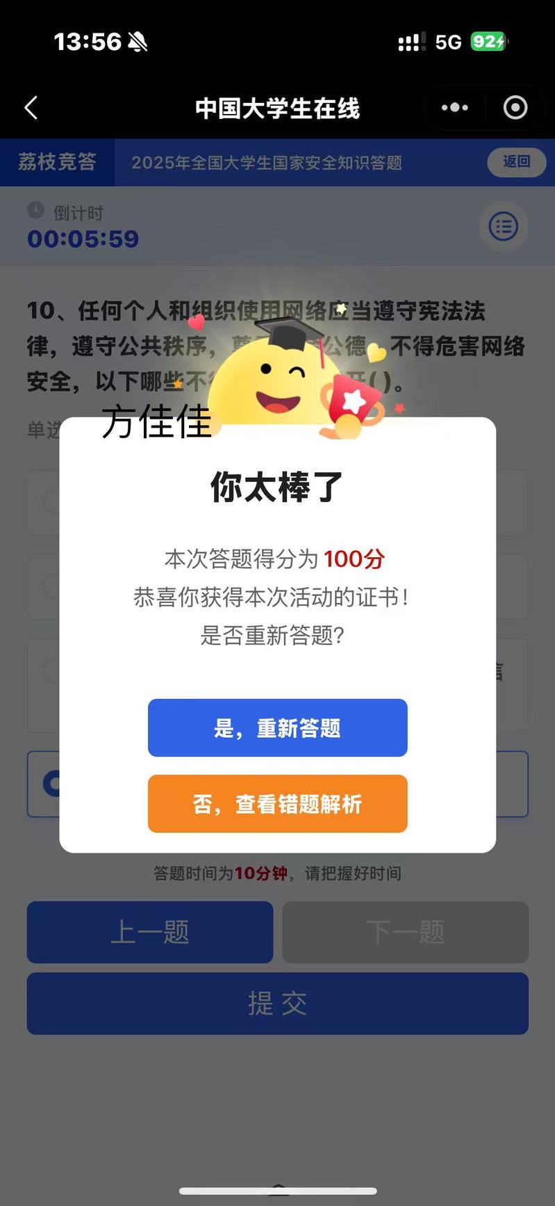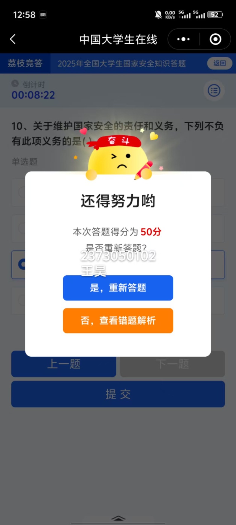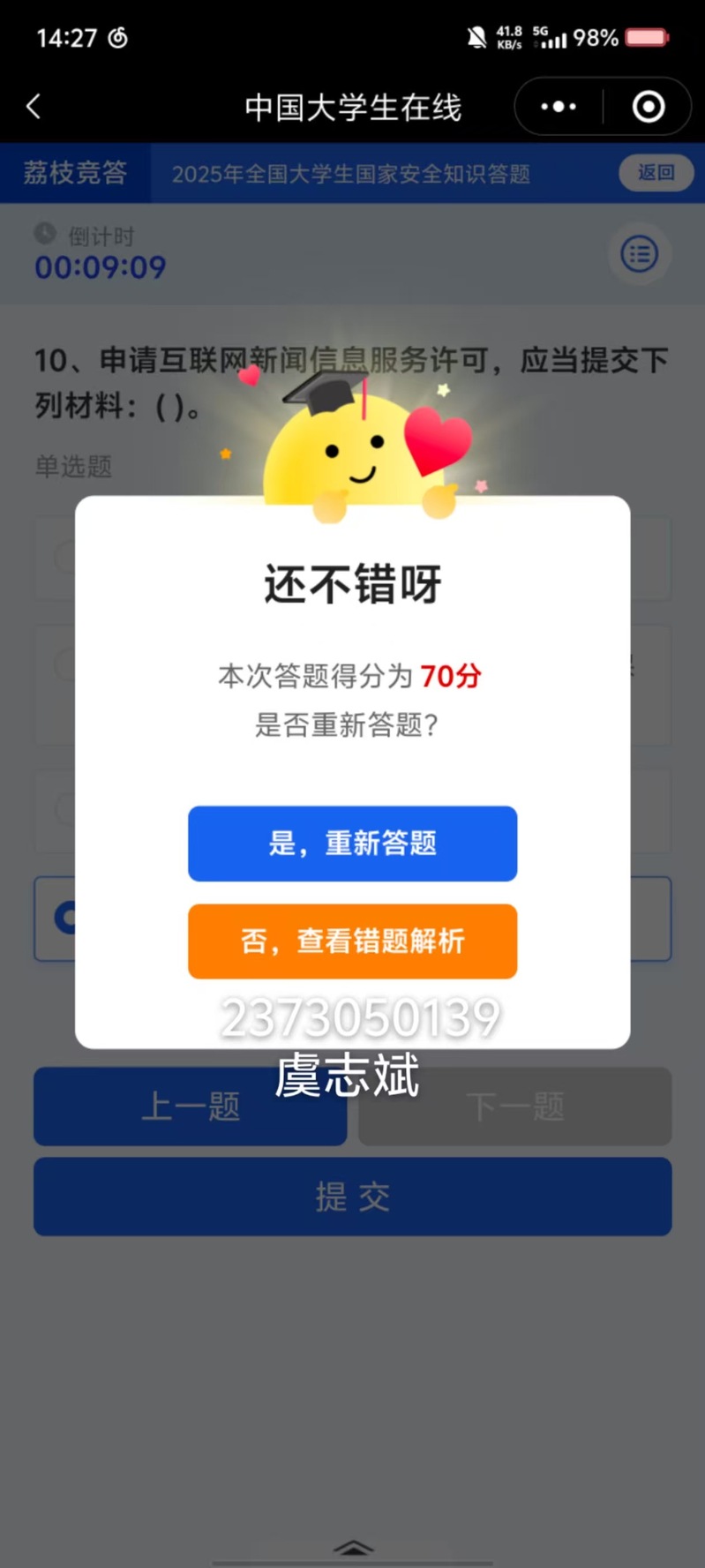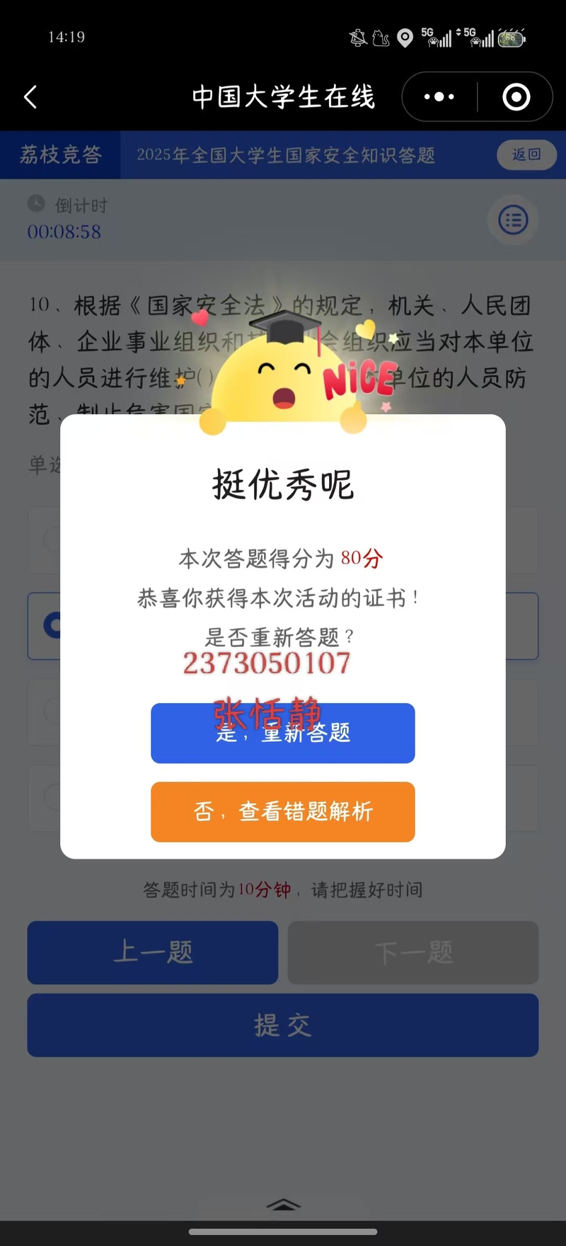 4月中旬,組織學生通過中國大學生在線網站或微信公眾號參與線上“全國大學生國家安全知識答題活動,通過答題活動引導同學們堅定維護國家政權安全、製度安全、意識形態安全,營造國家安全人人參與、人人有責的濃厚氛圍。