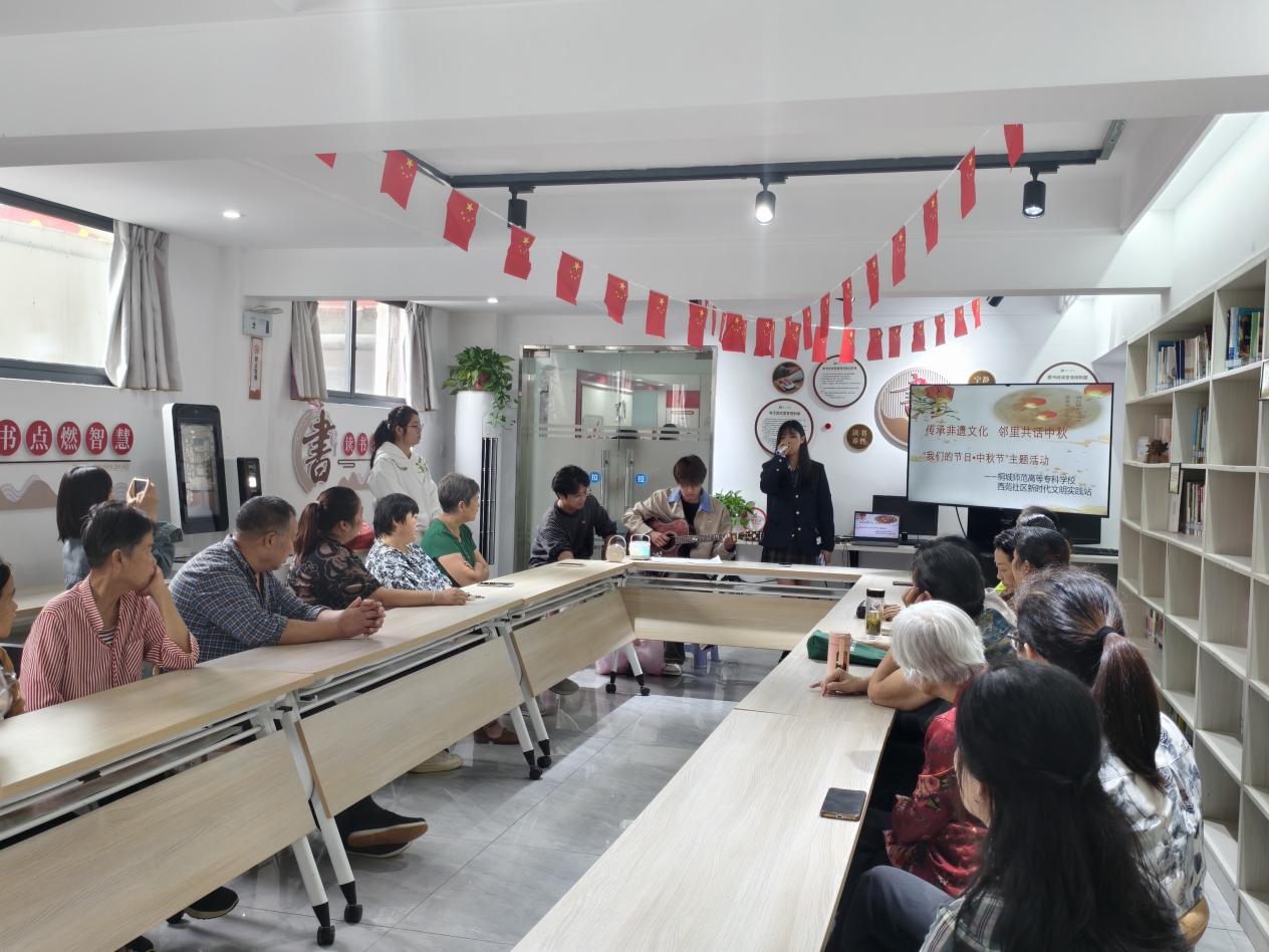 金秋送爽,丹桂飄香,在中秋佳節即將到來之際,為傳承非遺文化、弘揚傳統節日精神,9月30日上午,桐城師範高等專科學校藝術與設計係聯合西苑社區,在西苑社區紅色港灣開展“月滿中秋·非遺之音傳情”非遺進社區活動。桐城師專2023年度校級人文社科青年項目“非遺傳統與現代高校‘雙向奔赴’——桐城歌在桐城師專的傳承、發展實踐”(項目編號:TCSZ2023SKqn01)負責人周今老師、藝術與設計係學生黨支部書記程周鵬老師、係團總支書記胡文君老師,與係部團員青年、入黨積極分子及青年誌願者共同參與,與西苑社區居民齊聚一堂,在文化交融中共度溫馨時光。
