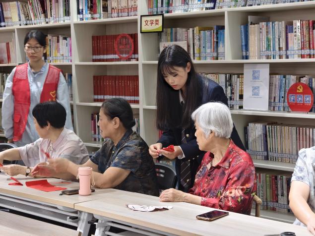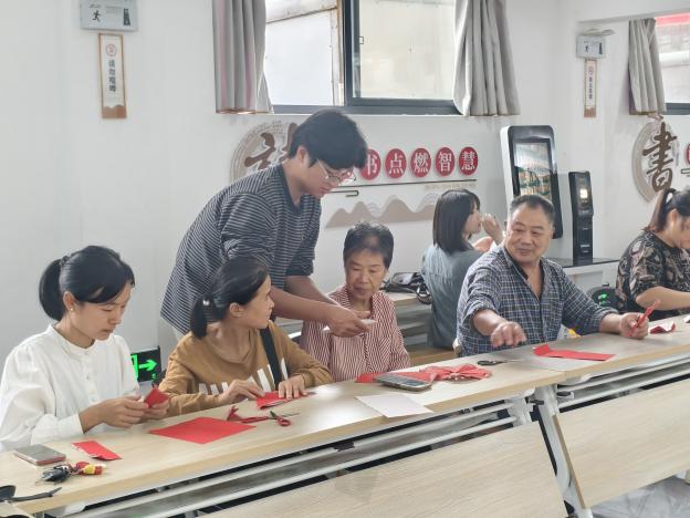 “歌聲裏有中秋的浪漫,指尖上更能留住中秋的美好!”,文藝表演過後,最受期待的非遺剪紙互動環節正式開啟。藝術與設計係誌願者們帶領社區居民一起用剪刀在紙上勾勒出心中的中秋佳節。活動中,誌願者們耐心地指導著居民,從簡單的折紙到精細的裁剪,每一個步驟都充滿了樂趣。居民們也熱情高漲,紛紛發揮自己的創意,不一會兒,一張張精美的剪紙作品便呈現在眼前。大家拿著自己的作品,臉上洋溢著自豪的笑容,紛紛拍照留念,記錄下這美好的瞬間。
