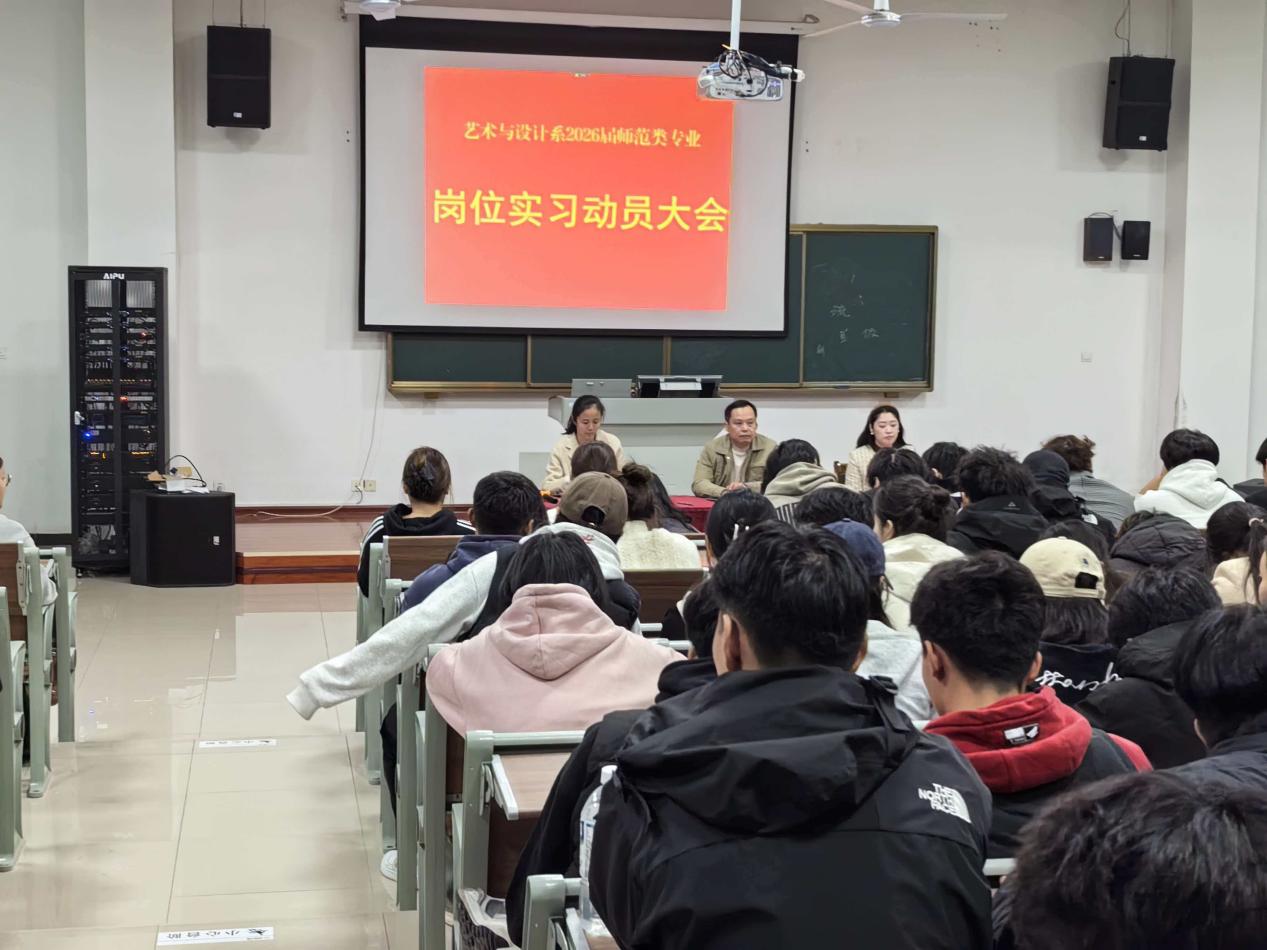 為明確實習任務、凝聚實習共識,確保師範生崗位實習工作順利推進,藝術與設計係於11月10日在以智樓報告廳隆重召開2026屆師範類專業崗位實習動員大會。係部領導周琳、孫禺慧及全體實習指導老師出席會議,2026屆全體師範生參會,會議由張倩主持。