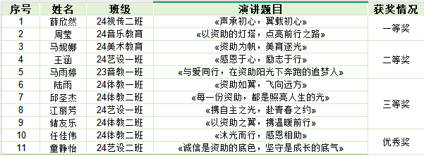 選手們的演講時而激昂澎湃,時而溫情脈脈,每一個故事都緊扣“資助”與“熱愛”的主題,既展現了受助學子在政策關懷下不畏困難、奮勇前行的精神風貌,也傳遞出“感恩於心、勵誌於行、傳遞溫暖”的價值追求,現場不時響起陣陣熱烈掌聲。經過評委從內容主題、語言表達、情感傳遞、台風儀表等維度的綜合評審,最終評選出一等獎2名、二等獎3名、三等獎4名及優秀獎2名。具體名單如下: