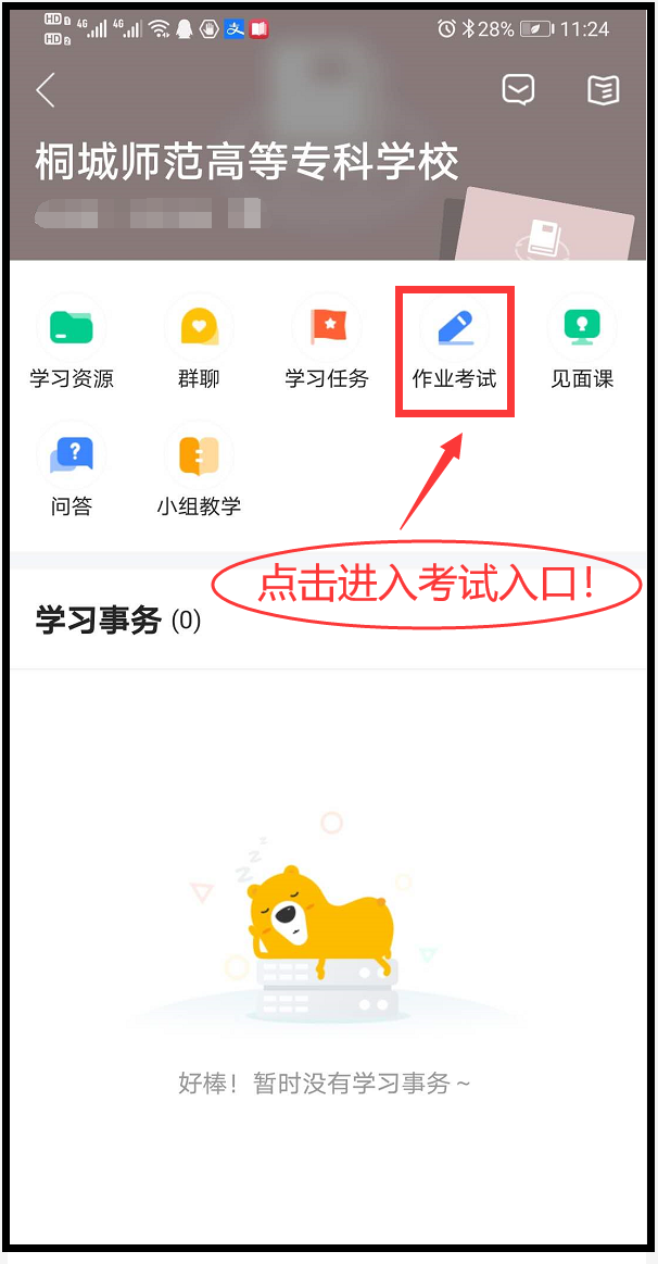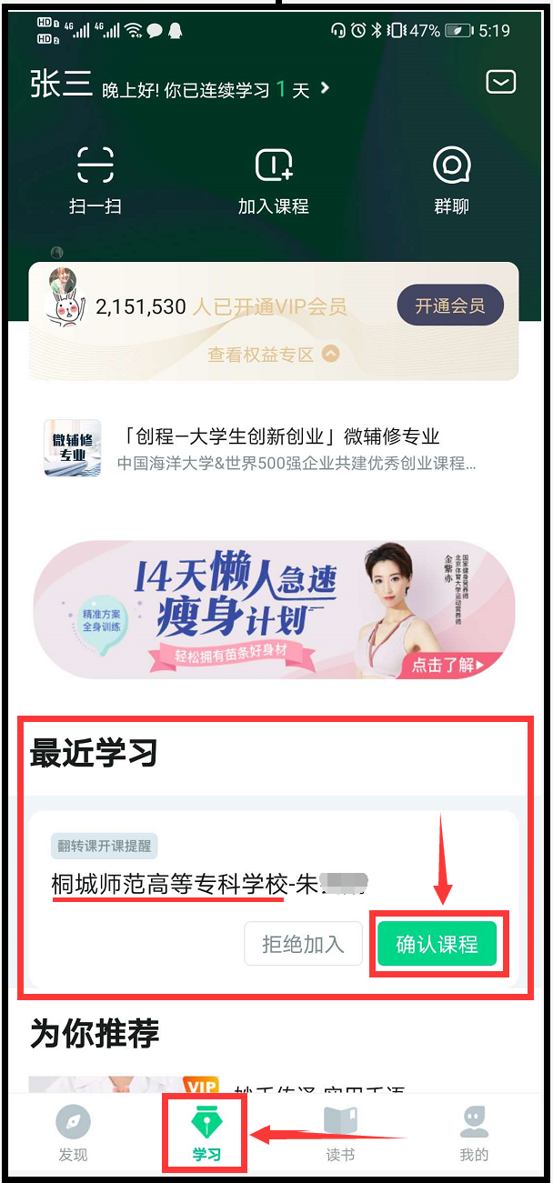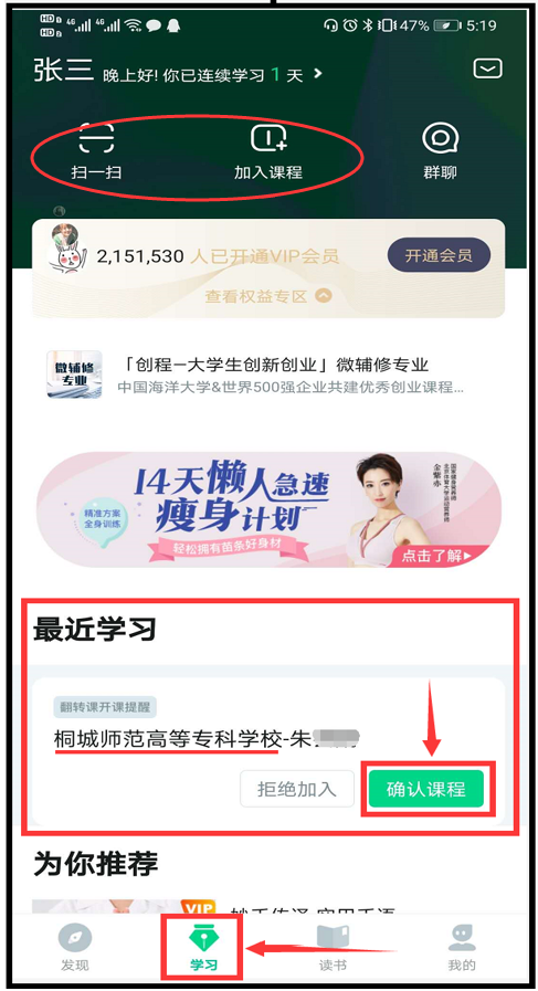 登錄完成後,點擊【學習】模塊,【最近學習】裏會出現“桐城師範高等專科學校--”的確認課程按鈕,如果未及時出現可嚐試多次下拉頁麵進行頁麵刷新,亦可點擊上方“掃一掃”掃描課程二維碼