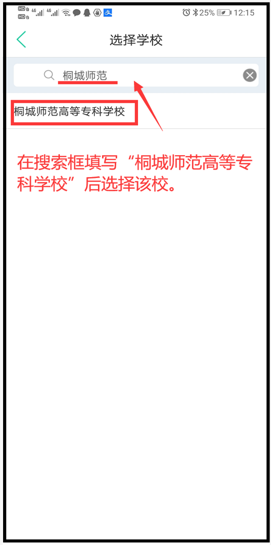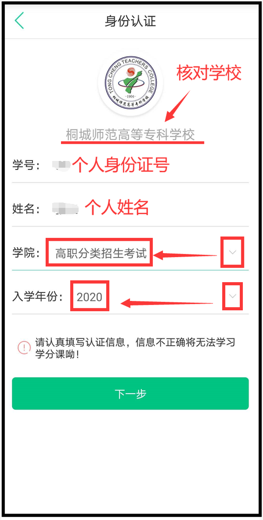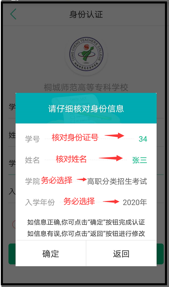 先選擇學校:“桐城師範高等專科學校”,而後進入身份認證頁麵,空格信息務必按照下方示例填寫。