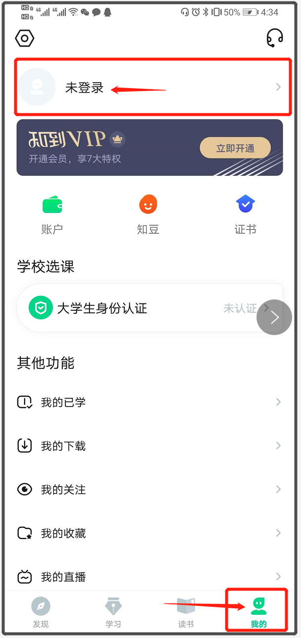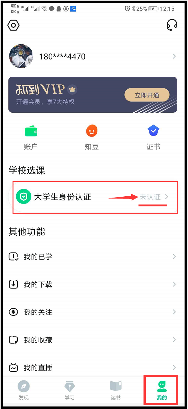 完成手機賬號注冊後,開啟知到之旅,在【我的】模塊進行【大學生身份認證】。