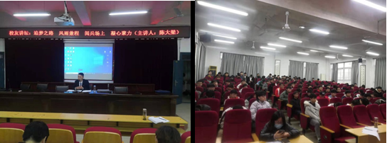 為宣傳學校育人效果,樹立學校良好形象,引發在校學生內在共鳴,使在校生得以自我發現與認可,激發學生成功欲和成就欲,形成積極向上的學習氛圍,由桐城師範高等專科學校學生處主辦,商貿與電子信息係承辦的校友講壇於3月8日下午14時30分在校以致樓報告廳開講,本次講座邀請到的是我校優秀畢業生陳大梁校友,主題為“追夢之路,風雨兼程,閱兵場上,凝心聚力”。講座由係分管學生工作副主任王煥庭主持,全校近200名男生聆聽了報告。