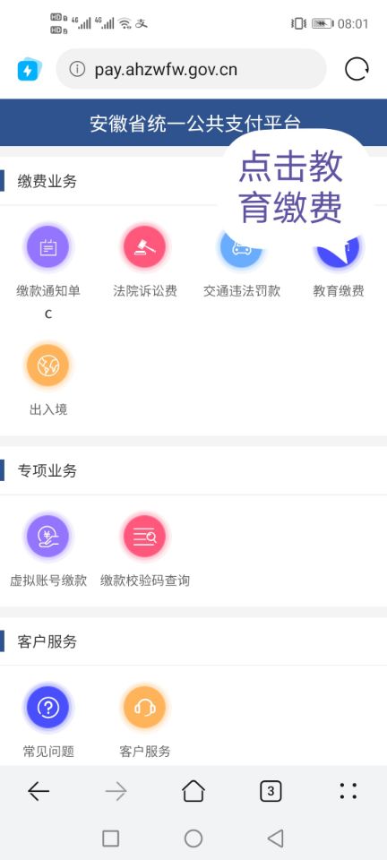 打開統一公共支付平台入口(https://pay.ahzwfw.gov.cn)或支付寶或皖事通界麵搜索教育繳費