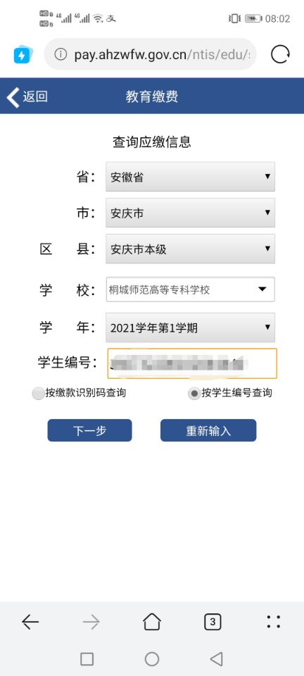 4.點擊安徽省安慶市安慶市本級、桐城師範高等專科學校(彈出來的有兩個桐城師範高等專科學校,第一次出現的是初專,第二次出現的高專,2021級小教全科學生屬於初專階段)、學年2021年第1學期、學生編號是本人身份證號碼。