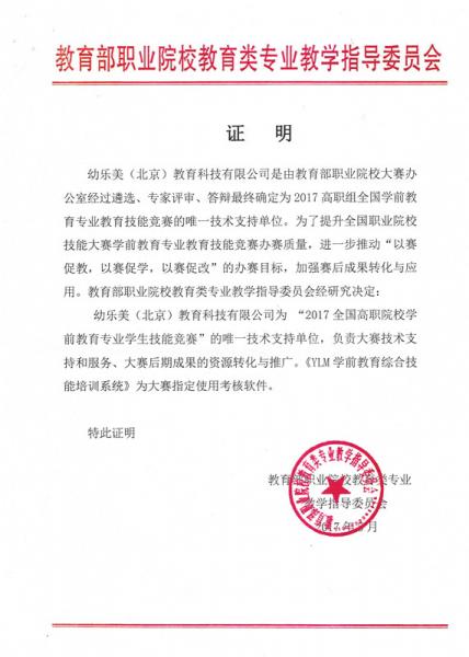 根據學期專業認證和學前專業技能大賽需求,學前教育係需購買幼樂美(北京)教育科技有限公司自主研發的學前教育大賽綜合技能培訓係統軟件,該軟件為教育部職業院校教育類專業教學指導委員會指定使用的比賽軟件(附證明材料)。